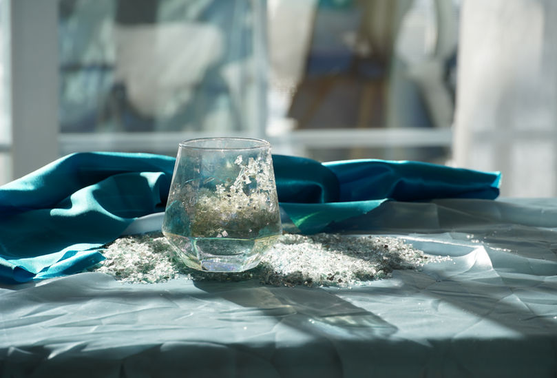 Synopsis on Conceptual Still Life Photographs Containing Wine Glasses, Crushed Glass, Sea Glass, and Satin Fabric by Michael Hanna: